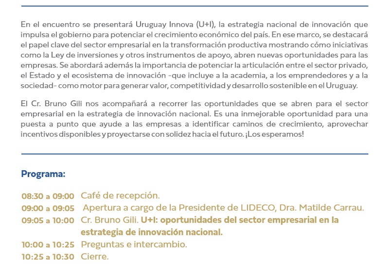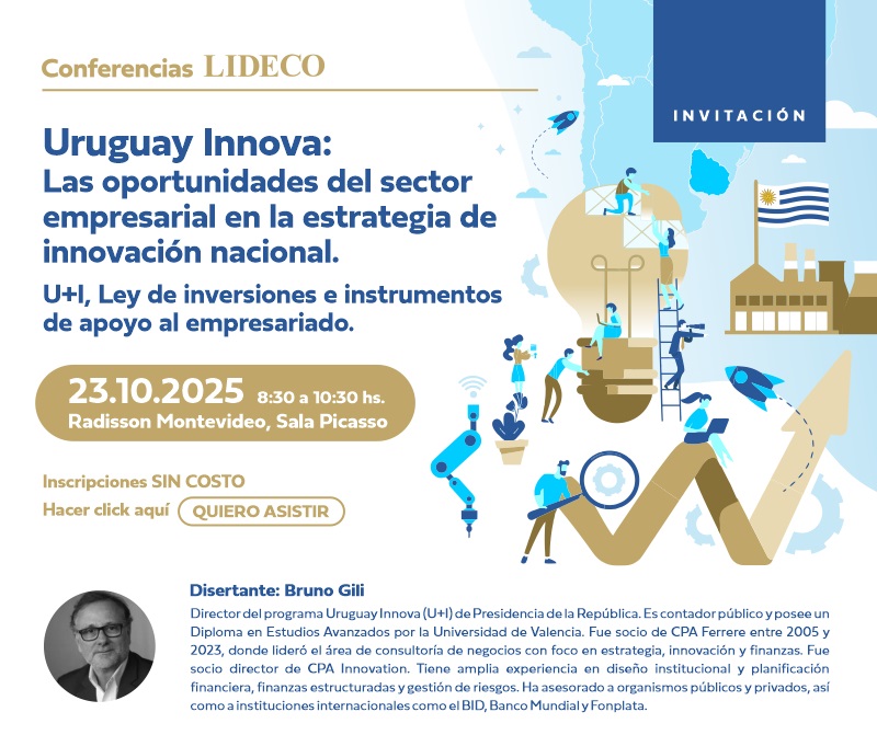 Conferencia LIDECO. Uruguay Innova: Las oportunidades del sector empresarial en la estrategia de innovación nacional. 08 Octubre 2025 Profundizamos sobre U+I, Ley de inversiones e instrumentos de apoyo al empresariado.
